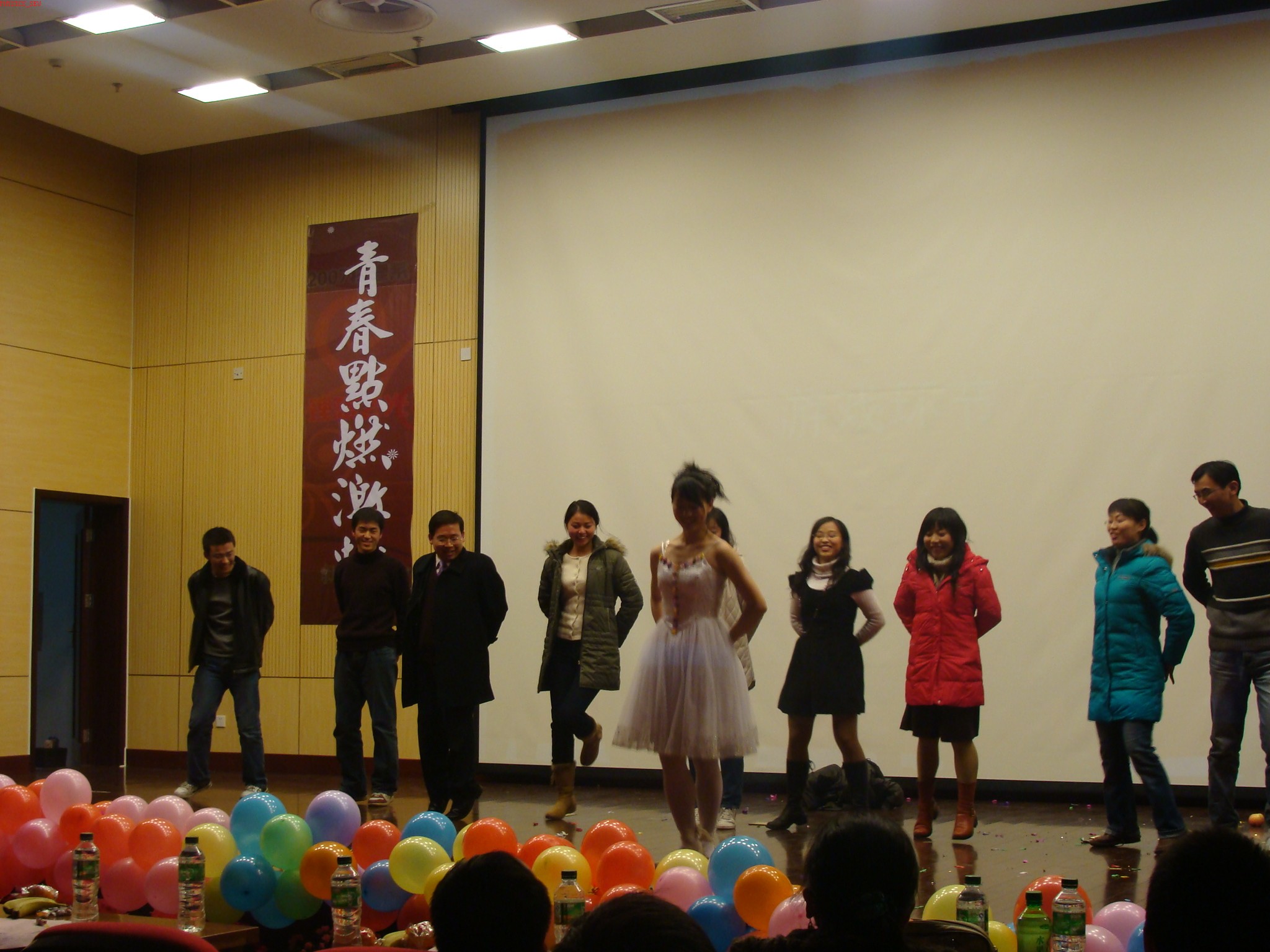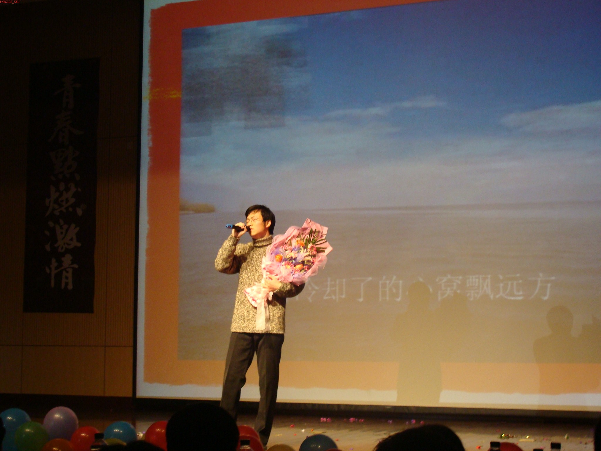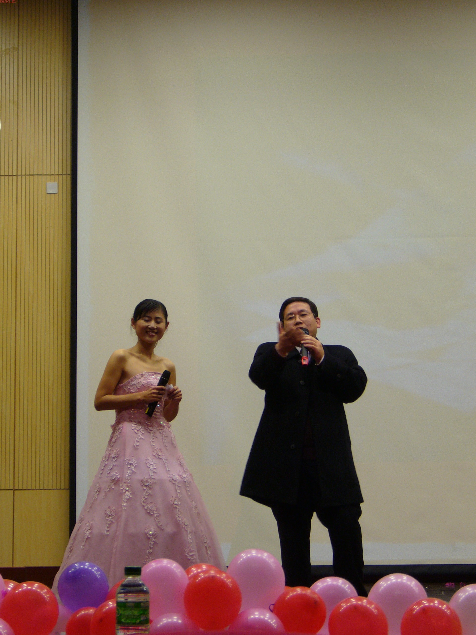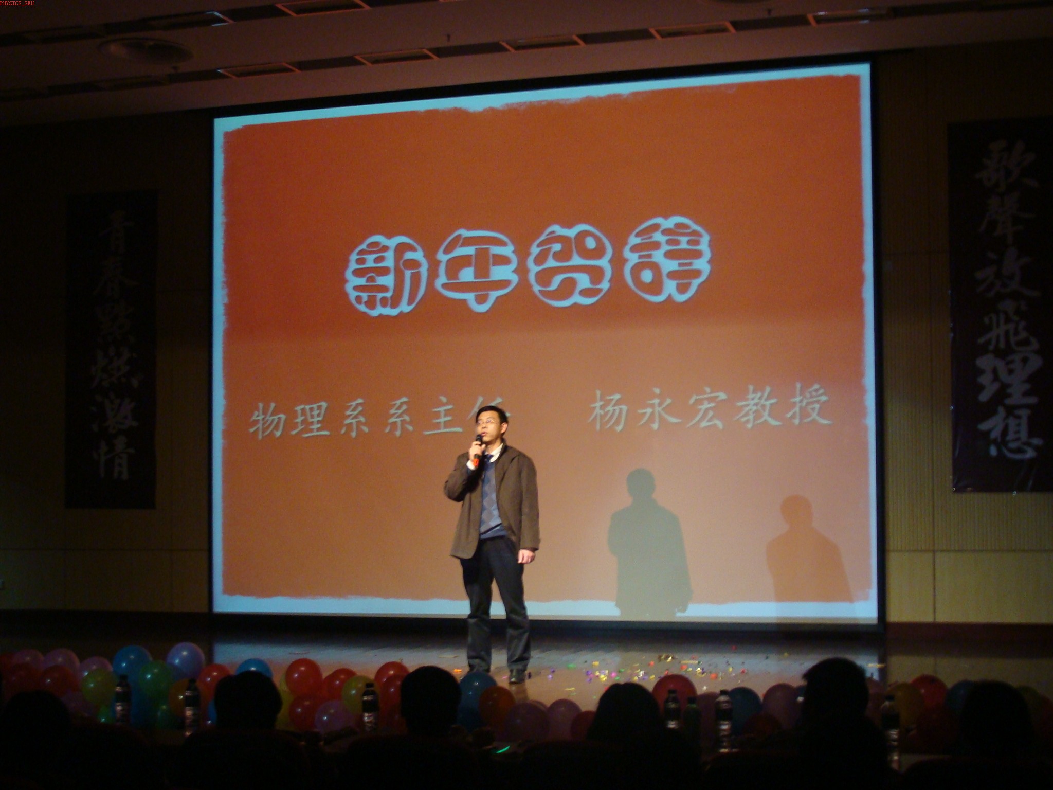 晚会开始,首先由物理系系主任杨永宏教授致新年贺词。杨主任从师资、科研、挑战与机遇几方面总结了物理系2007年的成绩,对新的一年进行了展望,并祝愿全体师生身体健康、学业进步、家庭和睦。