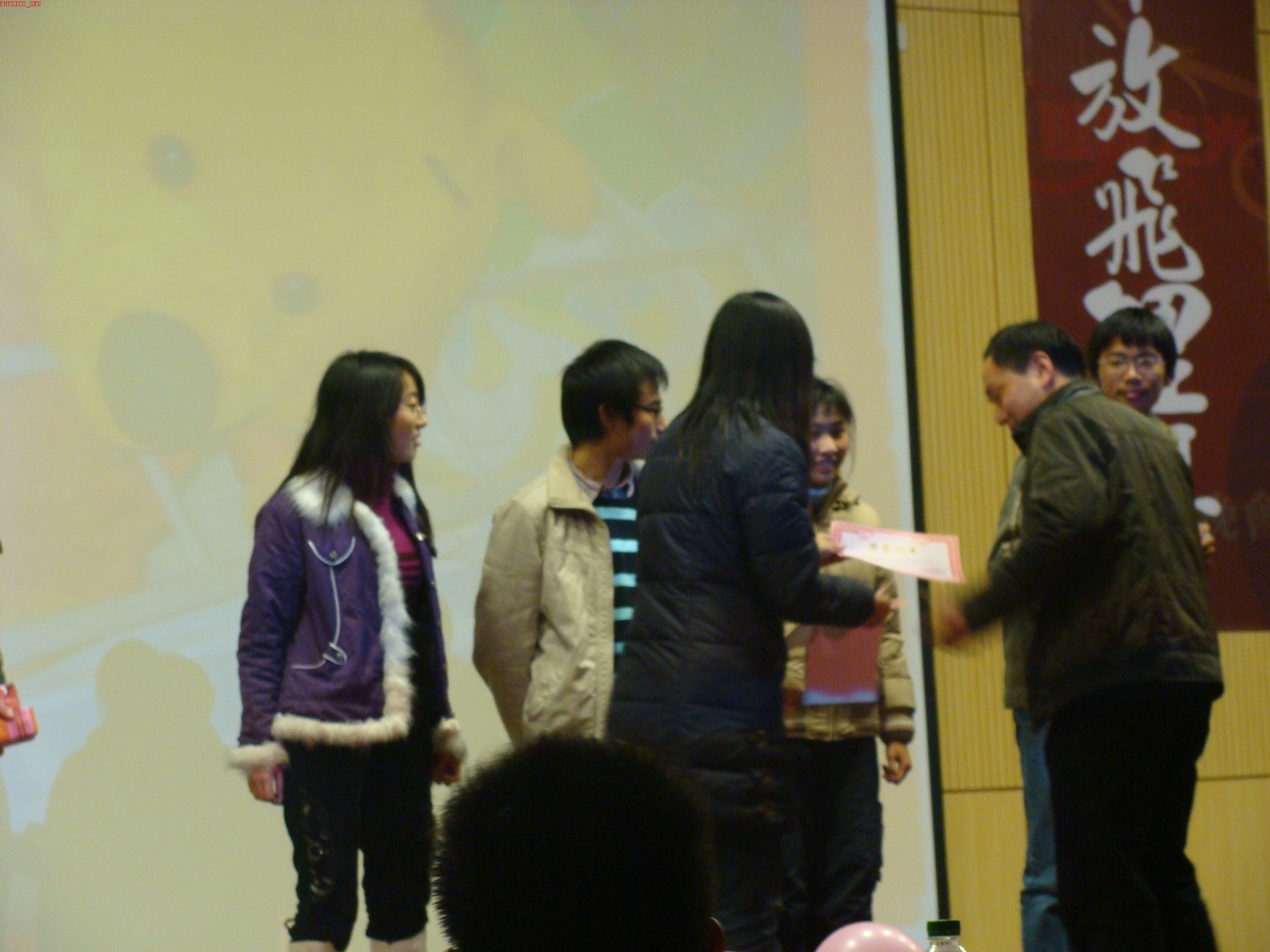 在晚会的中场,进行物理系篮球联赛和物理系魅力宿舍的颁奖仪式,这次颁奖为这两个活动画上了一个圆满的句号。物理系系报《格物》创刊号也晚会中正式发放,系报的发行使物理系的文化气息更加浓厚,《格物》以另一种方式搭建了全系师生了解物理系信息的重要,同时也是展示个人、班级魅力风采的舞台,沟通思想、交流经验的通道,放松身心、品味生活的驿站。值此辞旧迎新之际,系报的发行业就更有继往开来之深意。