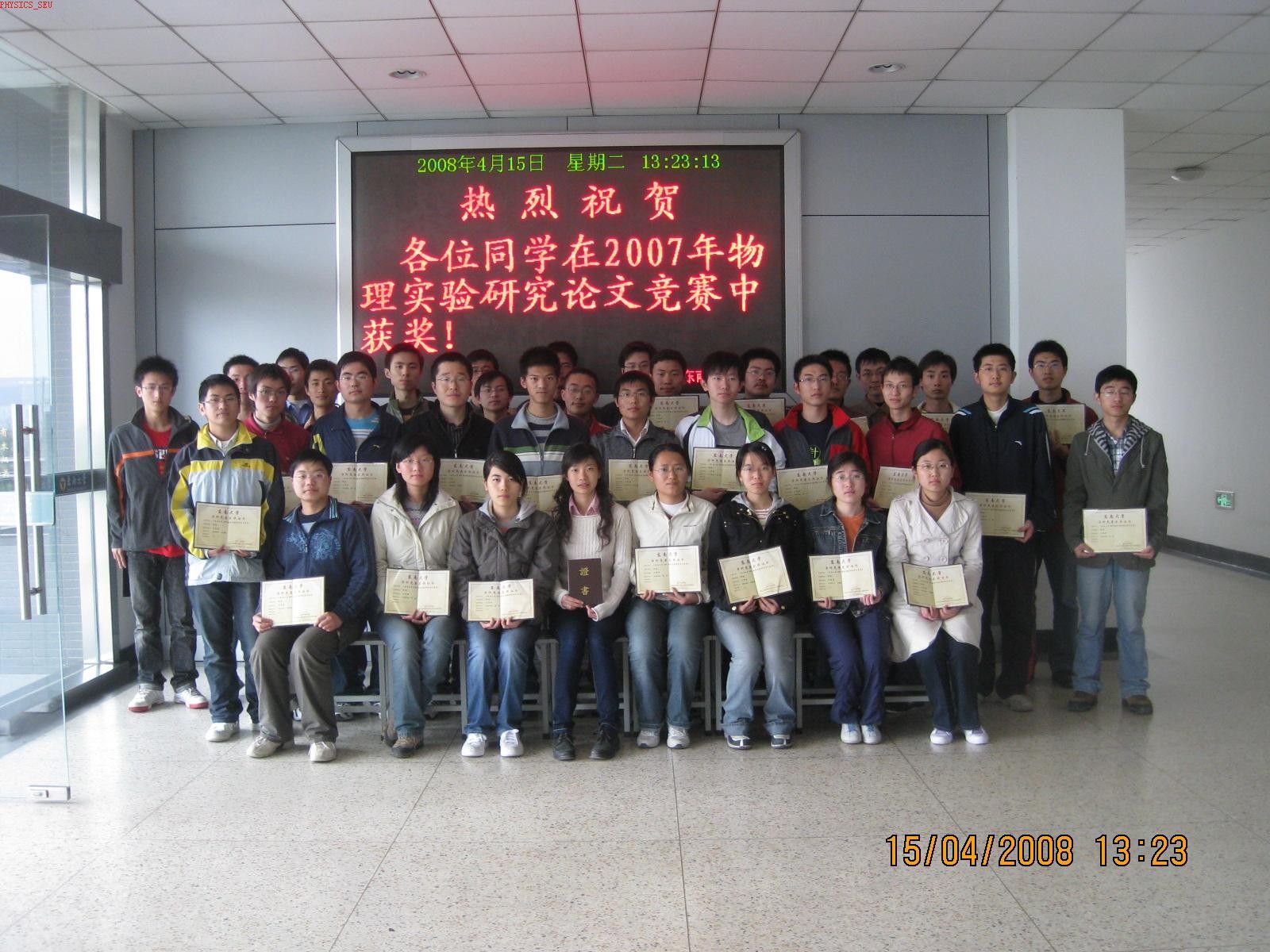 在本届物理实验研究论文竞赛中,我校600多位本科生积极研学,递交了参赛作品。经过三轮评审,最终38位同学获奖。其中自动化学院的徐凯(08005218)、物理系的吉新程(10105112)和软件学院的陈丕奇(71105409)获得一等奖,季杰、杨良等13位同学获得二等奖,吴俭、徐弘升等22位同学获得三等奖。物理实验中心负责人给每位获奖同学颁发了证书和论文集,并合影留念。