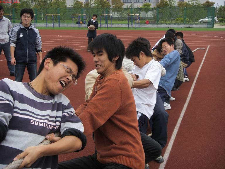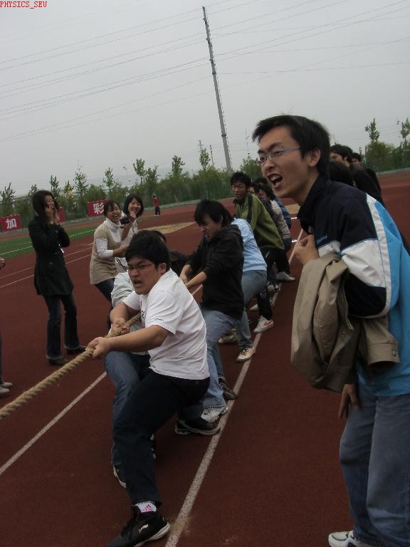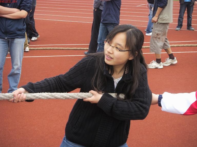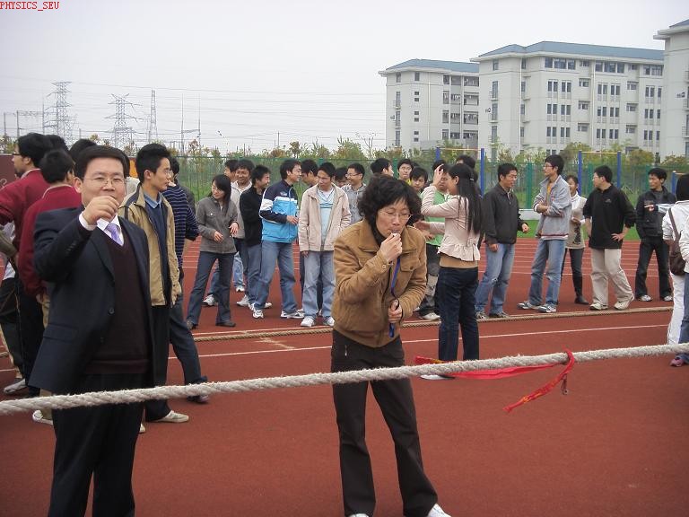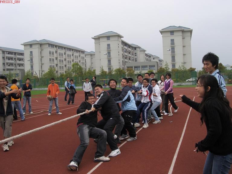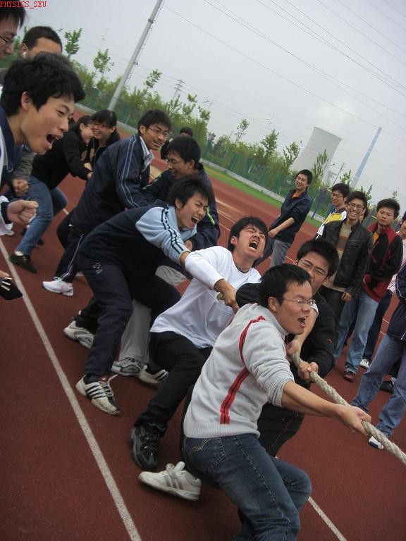 4月22日中午,梅园操场上加油助威的呐喊及庆祝胜利的欢呼声不时传来。2008东大物理系三大联赛中的拔河比赛在这里正式开赛。今天主要进行了大一及大三的年纪内部小组赛。物理系党委陆书记、章书记亲自到比赛场地为拔河比赛发令,各年级辅导员也到场参加。