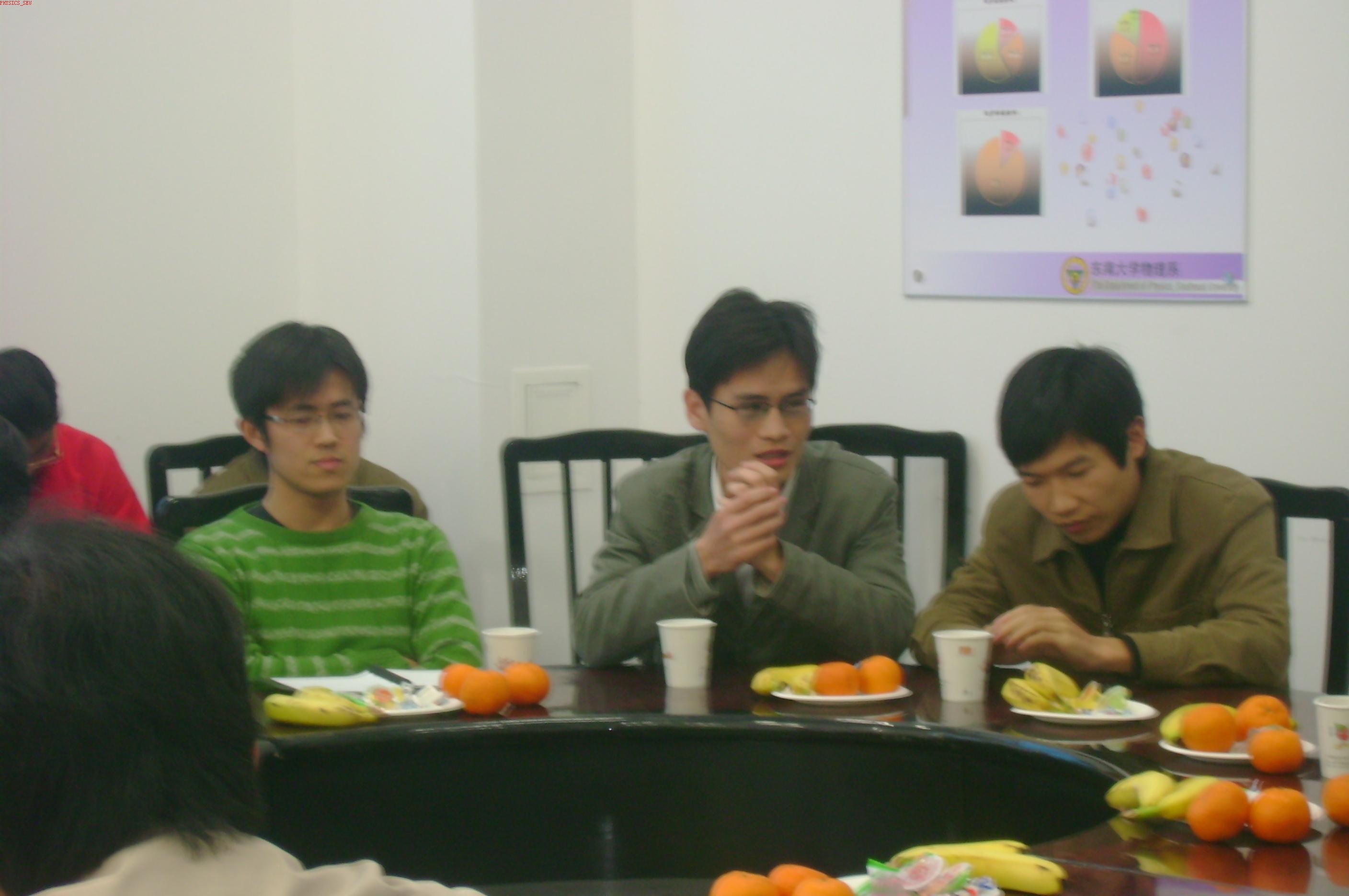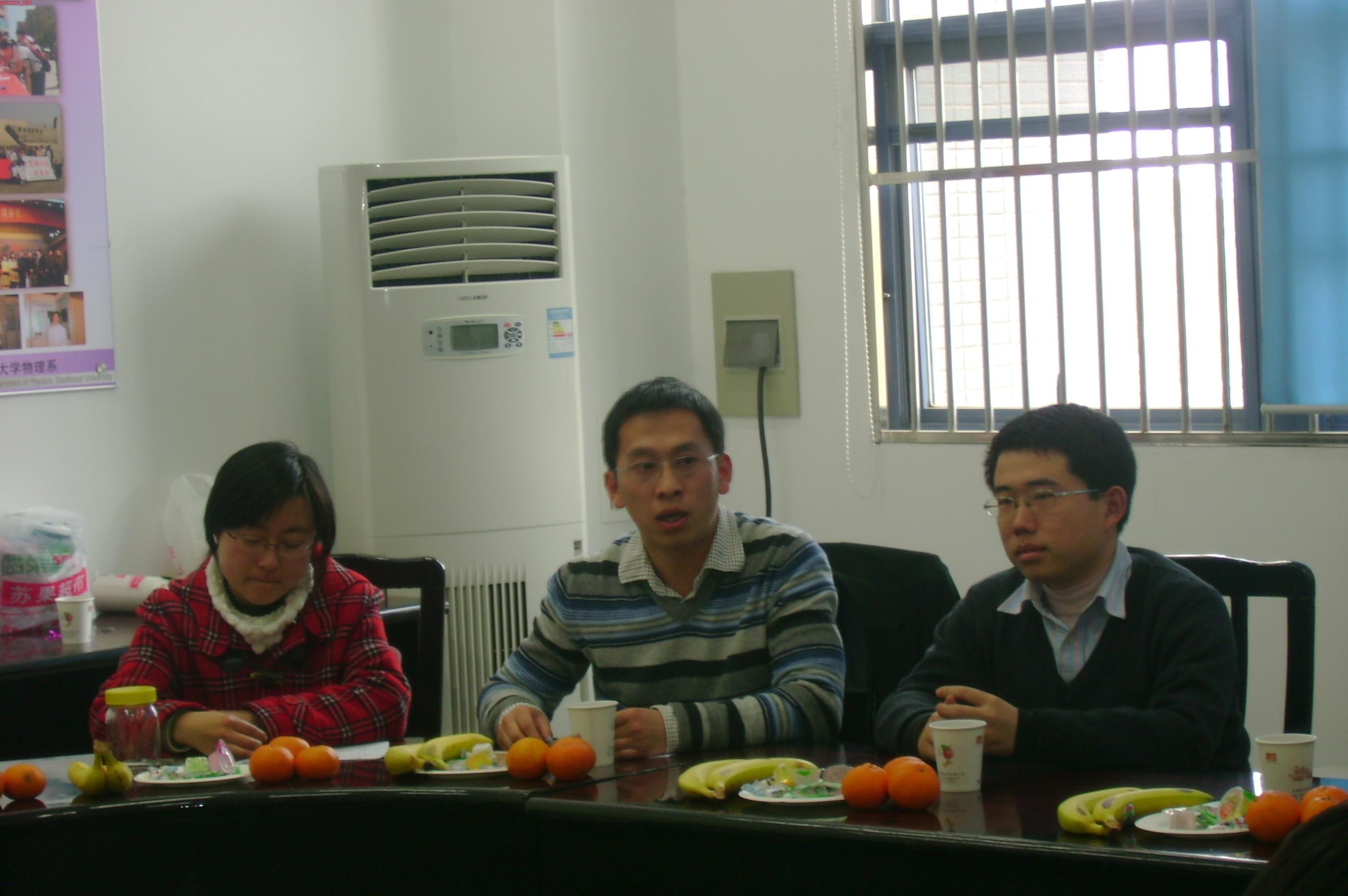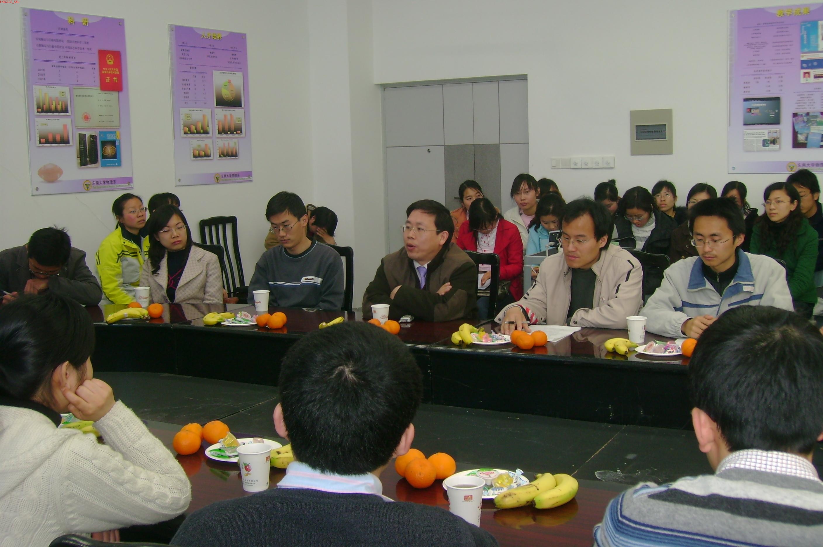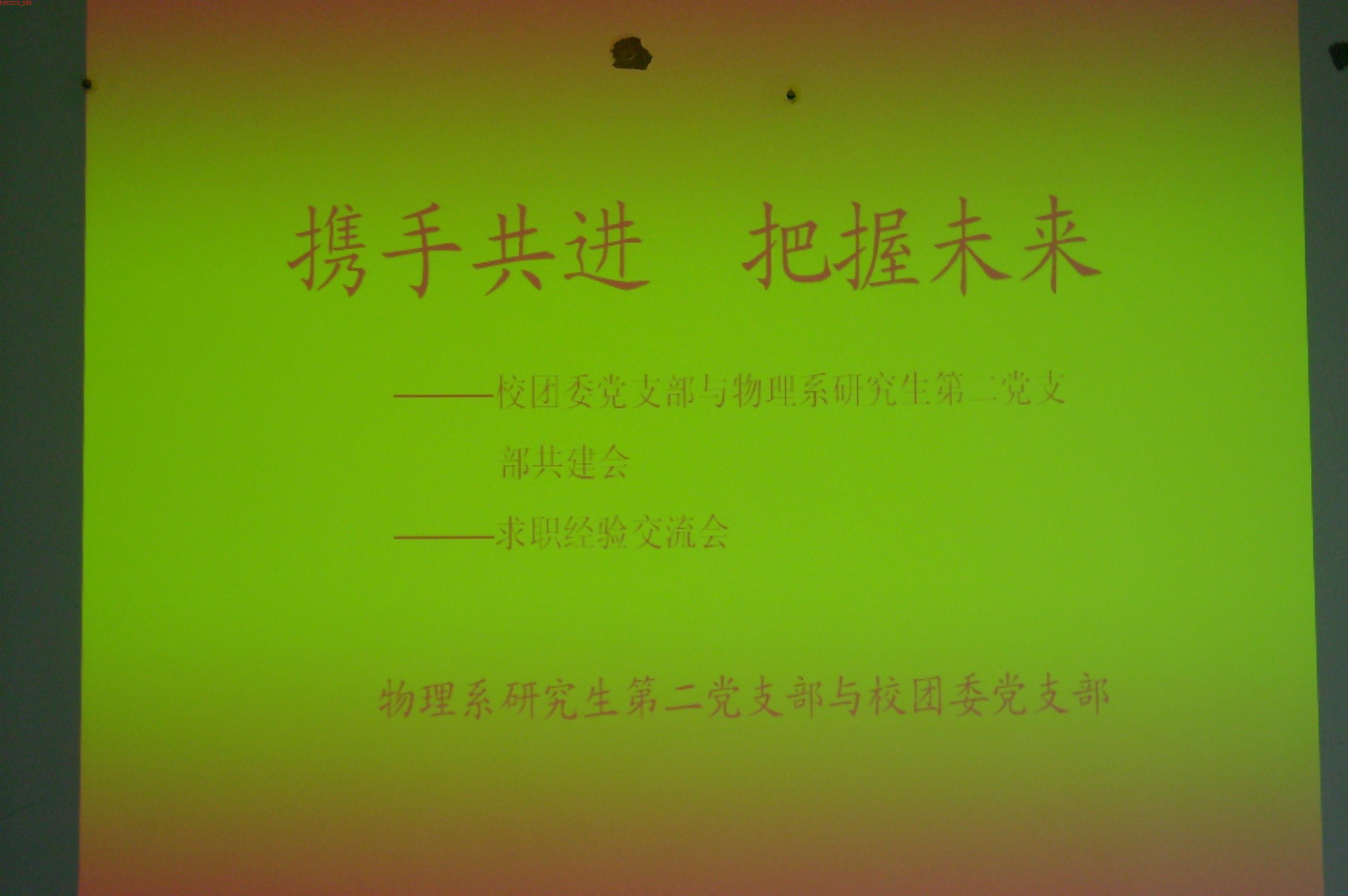 首先,两个支部相互简单地介绍了自己支部的情况。会上物理系党委副书记章荣琦老师作发言指出,机关党支部与基层党支部结对共建是我们学校党委工作的创新之举,对充分发挥党的基层组织在各项工作中的战斗堡垒作用意义深远。并切实要求物理系研究生第二党支部在与校团委党支部结对共建中虚心向团委的领导老师学习,努力把研究生党支部的各项工作做实做牢,积极配合校团委党支部的各项活动开展工作。章书记对我系研究生就业一直非常关心并倾注了很大的精力。章书记强调以人为本,关注民生是我们党的执政理念,而研究生的就业问题是民生之本的重要体现。学生就业是对学校教育质量评价的纬度之一,也是学校“以人为本,建设和谐校园”的很重要的组成部分。就业好坏也是内外因共同作用的结果,虽然现在看起来就业形势一年紧似一年,我们只要很好地定位,并及时做好对外部形势的了解,再积极主动地修练
