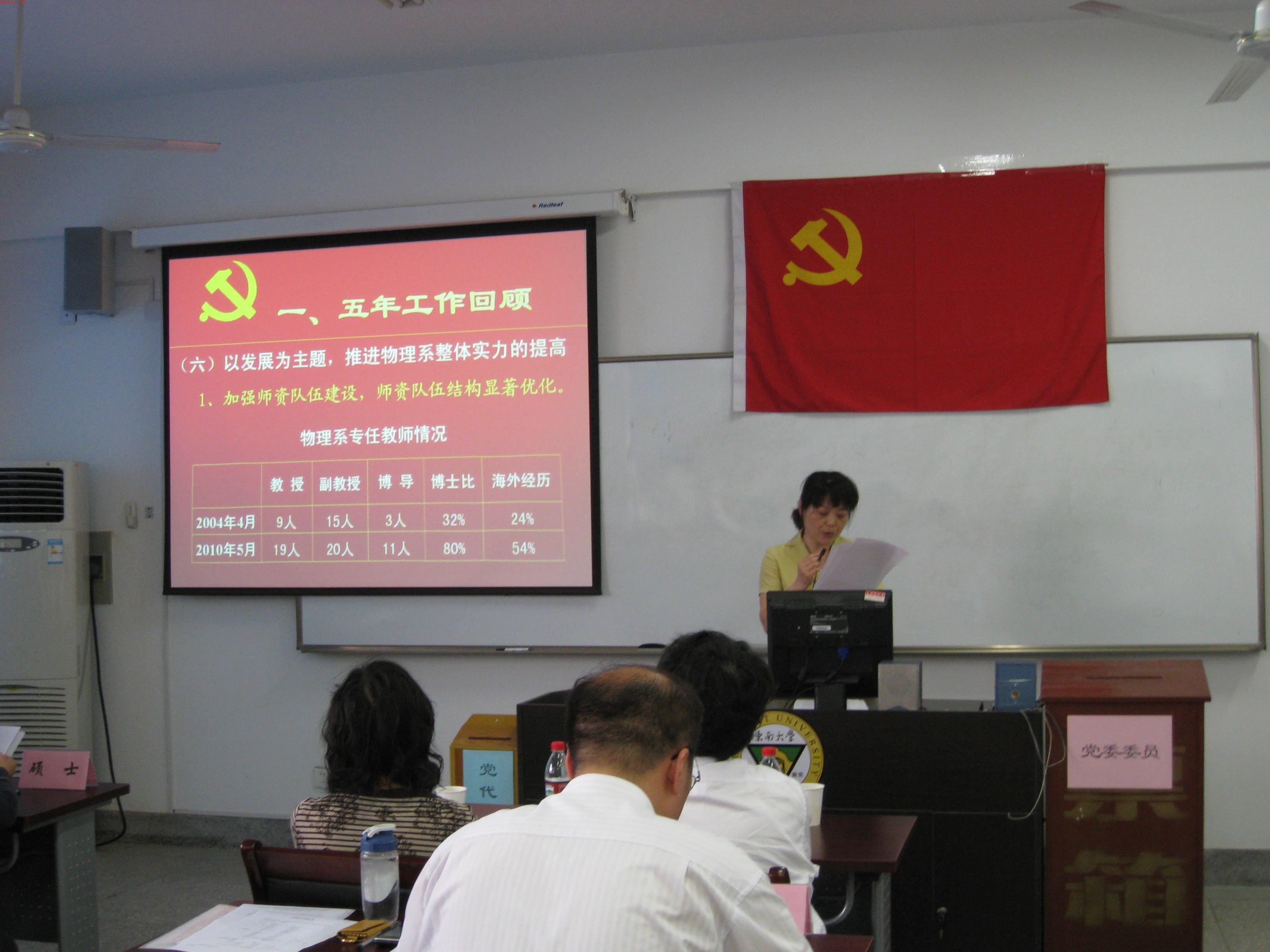 本次党员大会共有111位党员参会,其中应到会有选举权的正式党员88人,实到84人。大会由物理系党委副书记裴锋主持,系党委书记高嵩代表本届物理系党委作工作报告,报告回顾了物理系党委自2004年底以来取得的成绩,明确了今后的努力方向。