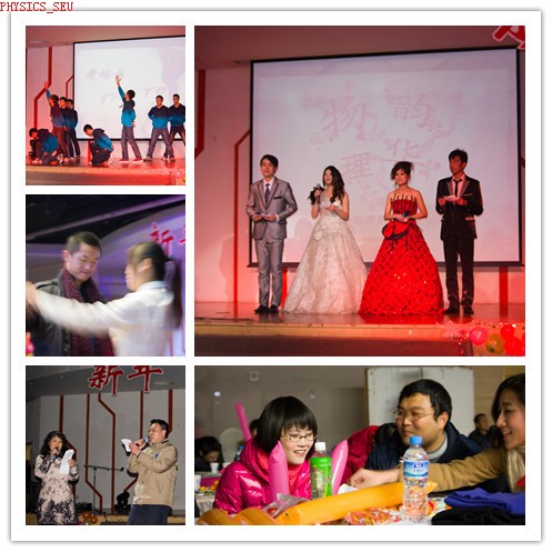 20111221日晚,我系“物韵理华”主题元旦晚会在焦廷标馆二楼圆形多功能厅成功举办。此次活动由物理系分团委学生会主办,在主席团的带领下,宣传、文化、生活、组织、学编、体育等部门分工协作,为观众们带来了一场美轮美奂的饕餮盛宴。全系本研同学以及系主任杨永宏老师、系党委书记高嵩老师、系党委副书记兼副系主任裴锋老师、副系主任汪军老师、副系主任戴玉蓉老师等系领导及各辅导员、班主任老师参加了本次晚会。