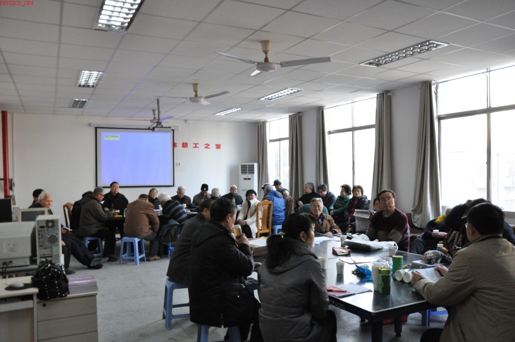 2011年12月30日,物理系党委书记高嵩、系主任杨永宏、系办分管退休工作的吕健民同志在四牌楼五五楼教师活动室与退休教职工亲切座谈。座谈会上,物理系党政负责人将2011年系党政主要工作向老同志们汇报,并传达了学校对退休教职工绩效工资改革的进展,此外认真听取老同志们对学校、物理系现状和发展的意见、建议,对老同志们的生活情况加以了解和关心。