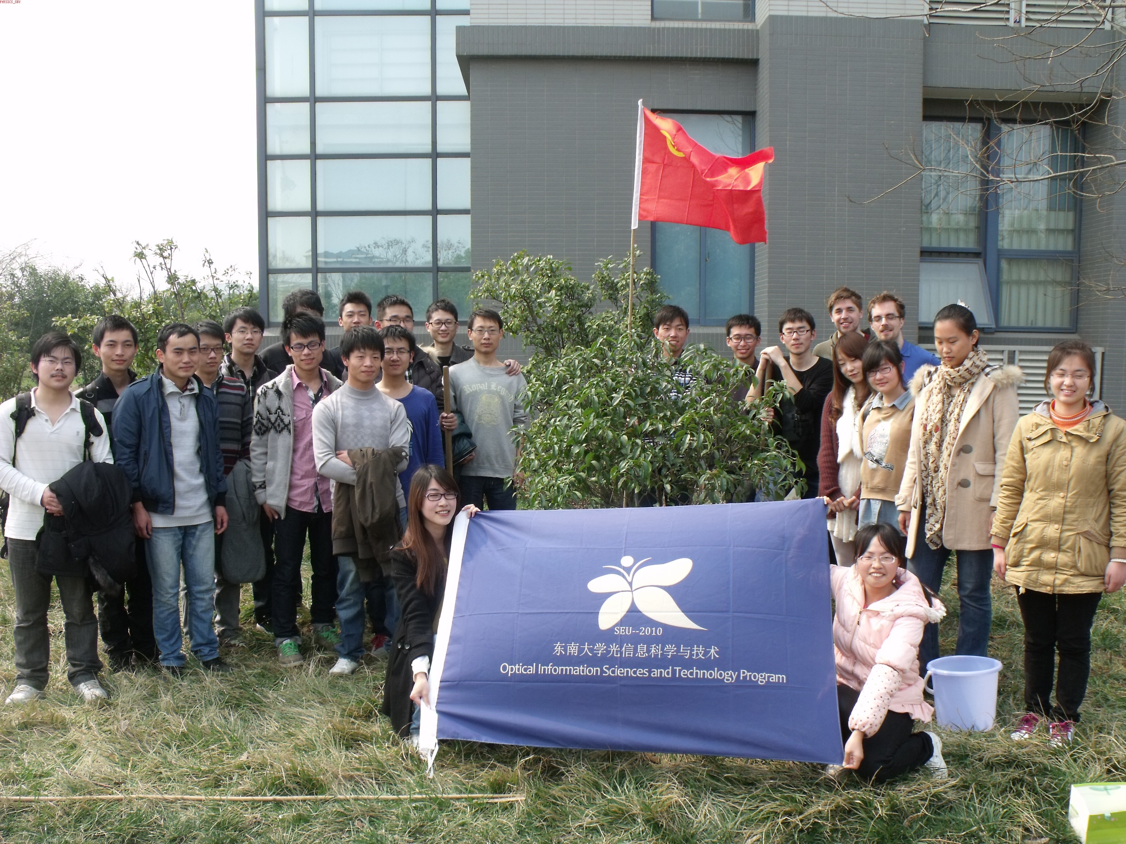 光信息科学与技术班班委们提前买来树苗、借来工具,并且放置好团旗和班旗,其他同学在十二点半在植树地点集合。选定地方后,男生们轮流用铁锹挖坑,女生浇水松土。经过半小时多的努力,终于挖出了直径半米左右,深三十多厘米的坑。然后由几位男生小心翼翼的将树放入坑内,填土、踩实,裴书记在旁热心提醒指挥。种完树后,光信息科学与技术班在树一米多远处埋下了包含全班愿望的许愿瓶。最后大家合影留念。