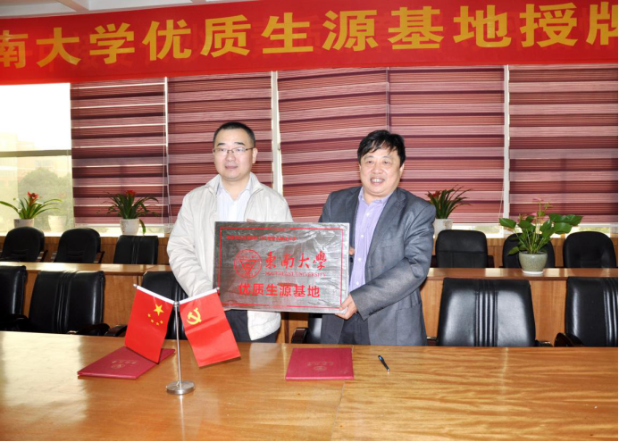(图为3522vip浦京集团官网学生处副处长、招生办主任蔡亮与宁乡一中校长欧阳才代表双方授牌)