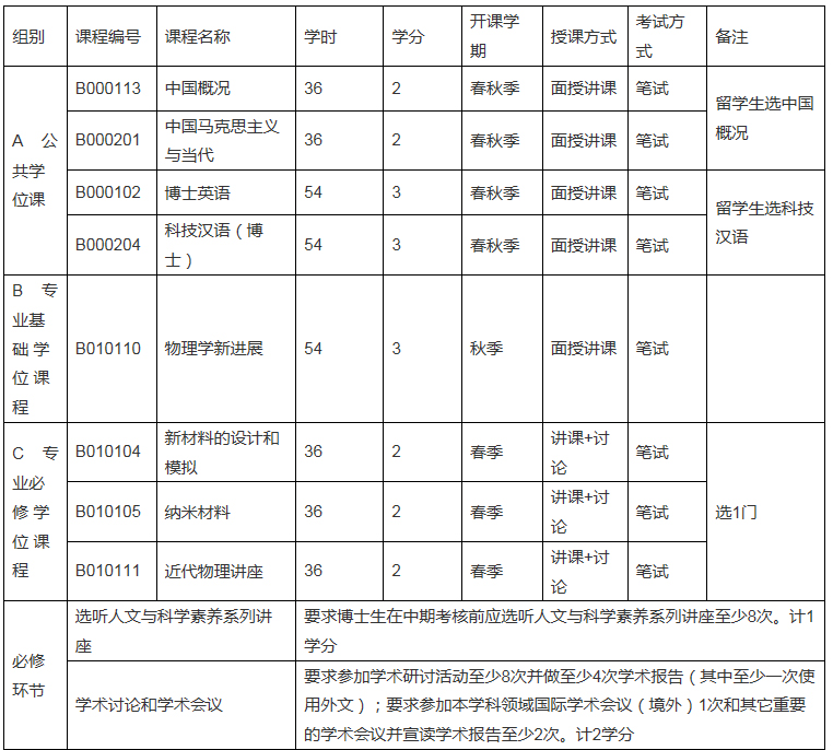 课程学习不低于28学分(入学后一学年半内完成),其中学位课程不低于16学分(入学后一学年内完成),此外还应完成必修环节3学分。学位课程和必修环节见附表,非学位课程从“研究生课程目录”中选择。