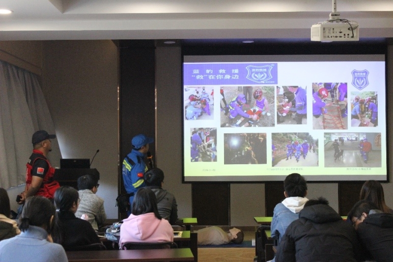 本次讲座分为现场讲解及个人实践操作两部分。蓝豹救援队基训教官首先介绍了蓝豹救援队在平时救援中发挥的巨大作用,让我们对他们的工作的重要性有了深刻的理解,接着教官阐释了院外急救的意义所在并详细讲解院外急救的要点并总结了口诀,以让大家在危机时刻能够顺利救助他人。