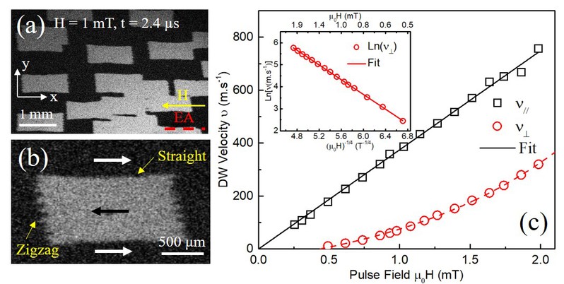 图注:(a) 沿易磁化轴方向施加脉冲磁场后单轴各向异性CoFeB(30 nm)薄膜的典型磁光克尔图像;(b) 矩形磁畴的放大磁光克尔图像,显示出直线形磁畴壁和锯齿形磁畴壁,两者分别平行和垂直于易磁化轴,黑白箭头分别表示磁畴内外磁化方向;(c) CoFeB(30 nm)薄膜中锯齿形畴壁(黑)和直线形畴壁(红)的速度与磁场的关系,插图为直线形磁畴壁