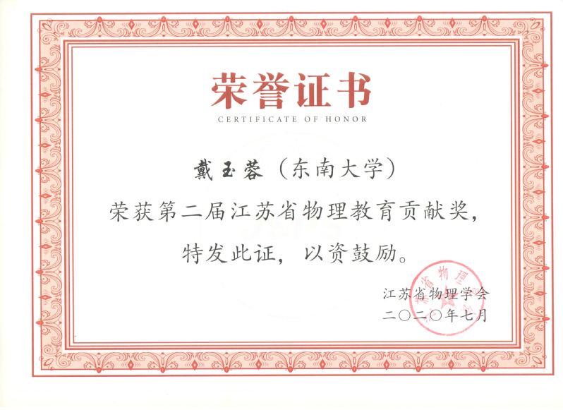 5月15日,江苏省物理学会在南京师范大学召开2021年春季学术会议,其间颁发了省物理学会各奖项。3522vip浦京集团官网戴玉蓉教授获得“江苏省物理教育贡献奖”。该奖项旨在奖励在大学阶段物理教学研究、改革、发展、人才培养等方面取得突出成绩的优秀物理教师,本次大学组共2人获奖。