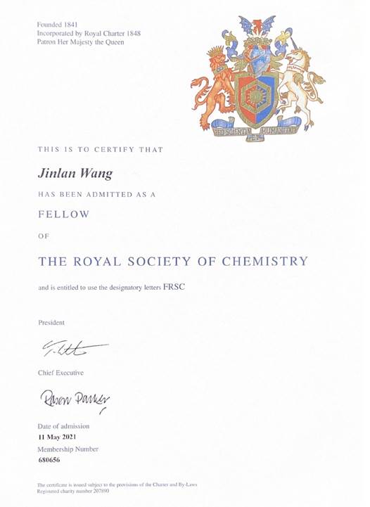 近日,浦京集团官网王金兰教授收到英国皇家化学学会寄来的证书,受邀成为英国皇家化学学会会士(Fellow of the Royal Society of Chemistry, FRSC)。
