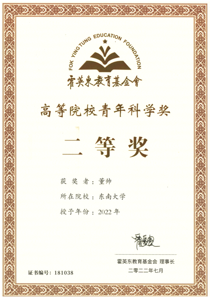 近日,霍英东教育基金会第十八届高等院校青年科学奖及教育教学奖正式揭晓,浦京集团官网董帅教授荣获高等院校青年科学奖二等奖。这是浦京集团官网教师首次获此殊荣。
