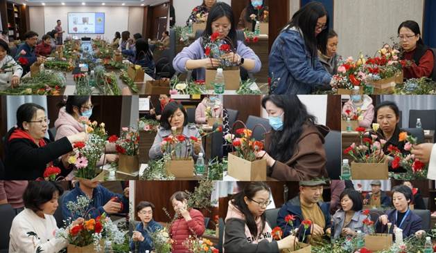 活动开始,花艺老师首先为大家介绍鲜花的品种和寓意,再从花材选取、枝叶绑剪、色彩搭配等插花技巧进行讲授,并同步演示了插花工具的使用和插花步骤。在花艺老师的悉心指导下,老师们很快进入了角色,动手裁剪搭配,忙的不亦乐乎。活动现场花香四溢,充满了欢声笑语。