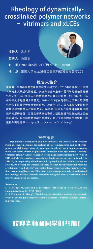 5月12日学术报告:Rheology of dynamically-crosslinked polymer networks-vitrimers and xLCEs