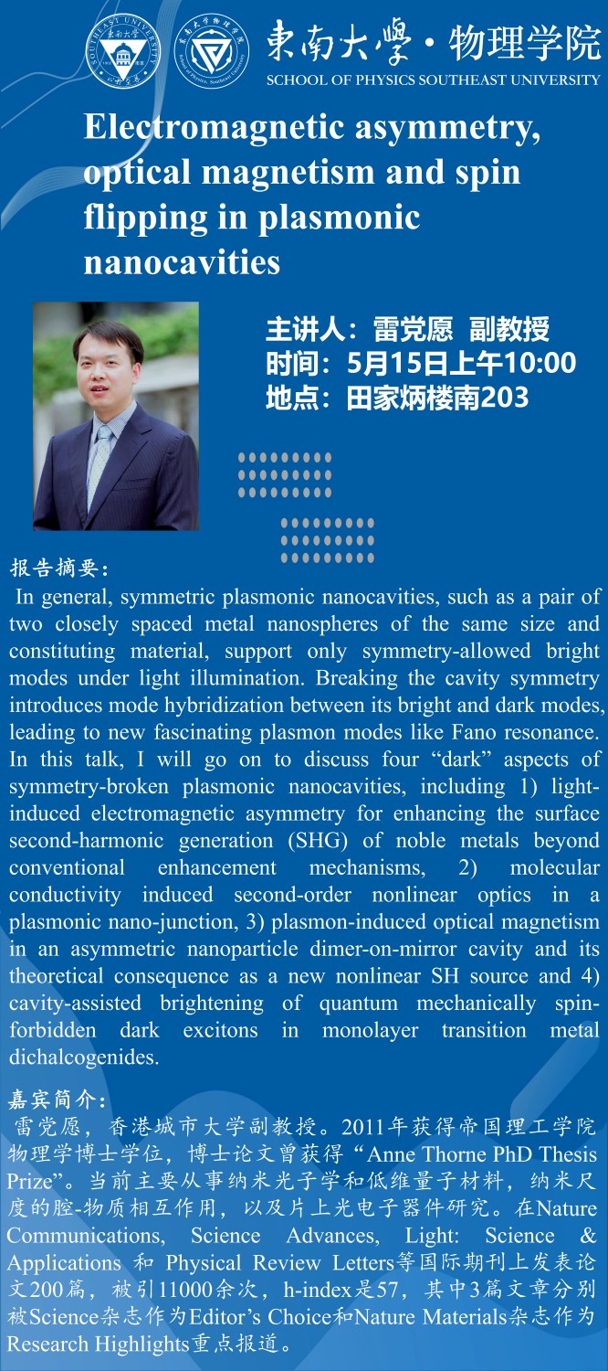 5月15日学术报告:Electromagnetic asymmetry, optical magnetism and spin flipping in plasmonic nanocavities