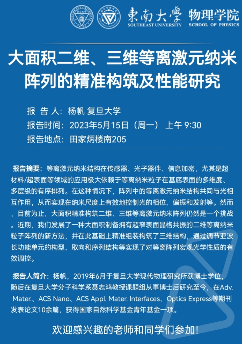 5月15日学术报告:大面积二维、三维等离激元纳米阵列的精细构筑及性能研究