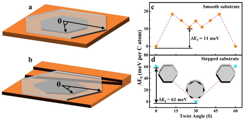 图1. 扭角双层石墨烯在 (a) 平整和 (b) 台阶衬底上成核外延的示意图。