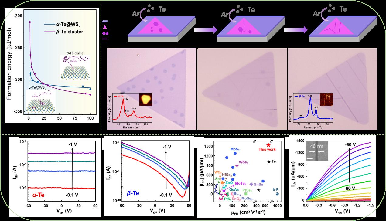 在本项工作中,倪振华教授、吕俊鹏教授课题组通过范德华外延方法实现了高纯度和高结晶质量的原子级薄的α-Te纳米片和β-Te纳米带的可控合成。结合理论分析发现该过程是通过原子团密度和界面相互作用引起的热力学竞争实现的。采用单层二硫化钨作为基底为范德华外延提供了平台,并诱导形成了对称六方相的α-Te纳米片和螺旋四方相的β-Te纳米带,首次在实验上实现了对α-Te和β-Te的相结构和厚度的协同控制。由于量子束缚效应,随着厚度的减小,α-Te纳米片从金属转变为n型半导体,而β-Te纳米带始终保持p型半导体性质,且其空穴迁移率高达~690.7 cm2 V-1 s-1,电流密度高达1.27 mA μm-1(Vds = -1 V)。此外,通过该方法制备的α-Te和β-Te样品在5-6个月后仍具有良好的稳定性。本工作表明范德华外延方法是精准调控二维材料相工程的一个可靠途径,有利于推动二维材料精准构筑的发展。