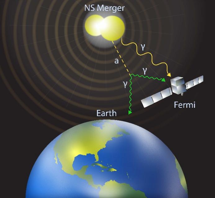 张永超教授及其合作者首次研究了GW170817中子星融合事例对类轴子粒子与光子相互作用的限制。类轴子粒子可以在中子星中通过与光子的相互作用产生,并飞出中子星。由于相互作用非常弱,类轴子粒子在飞行相当长的距离后衰变为两个光子。该光子可以被地球上的实验例如Fermi-LAT观测到(如图所示)。结合引力波的观测,类轴子粒子衰变产生的光子信号与直接从中子星发出的光子的时间信息和能谱都是不同的。因此Fermi-LAT实验的观测数据可以被用来限制类轴子粒子与光子的相互作用。研究发现,虽然Fermi-LAT的限制不如现有的超新星的限制强,但下一代的实验会增强很多,并排除更多的参数空间。