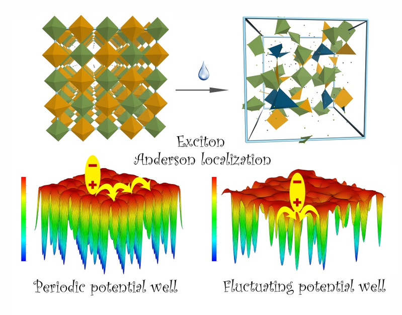 发生在无序系统中的电子安德森局域化是广受关注的凝聚态物理现象,它对电子的输运有重要影响。人们多年来相继观测到更为普遍的原子和光子等的安德森局域化现象。而观测电中性激子的安德森局域化则充满挑战性。3522vip浦京集团官网范吉阳教授课题组结合实验和理论计算,发现在合金化金属卤化物半导体中由于拓扑和元素成分无序导致Frenkel激子存在安德森局域化。晶格对称性破缺驱动激子波函数在多面体单元附近的散射干涉加强,这种效应与激子–声子耦合共同作用,导致激子强局域化。此种机制引起辐射量子跃迁增强和非辐射跃迁被抑制,使得光辐射量子产率从30%提高到75%。以上结果表明安德森局域化对无序宽禁带半导体中的Frenkel激子运动有重要影响。
