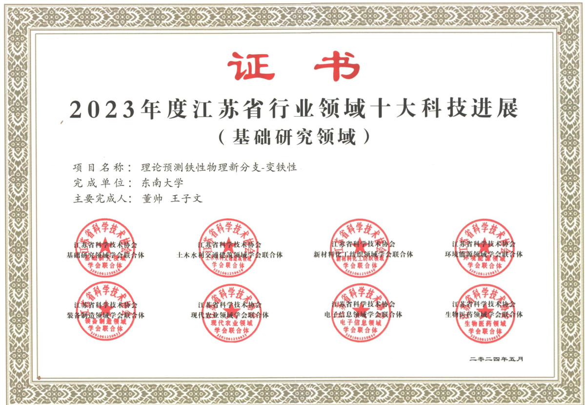 近日,省科学技术协会公布了“2023年度江苏省行业领域十大科技进展”遴选结果,浦京集团官网董帅教授团队凭借“理论预测铁性物理新分支-变铁性”的研究成果入选基础研究领域十大科技进展。
