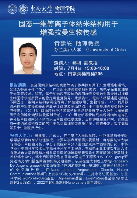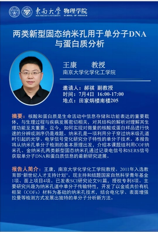 7月4日周四15:00学术报告|1.固态一维等离子体纳米结构用于增强拉曼生物传感2.两类新型固态纳米孔用于单分子DNA与蛋白质分析