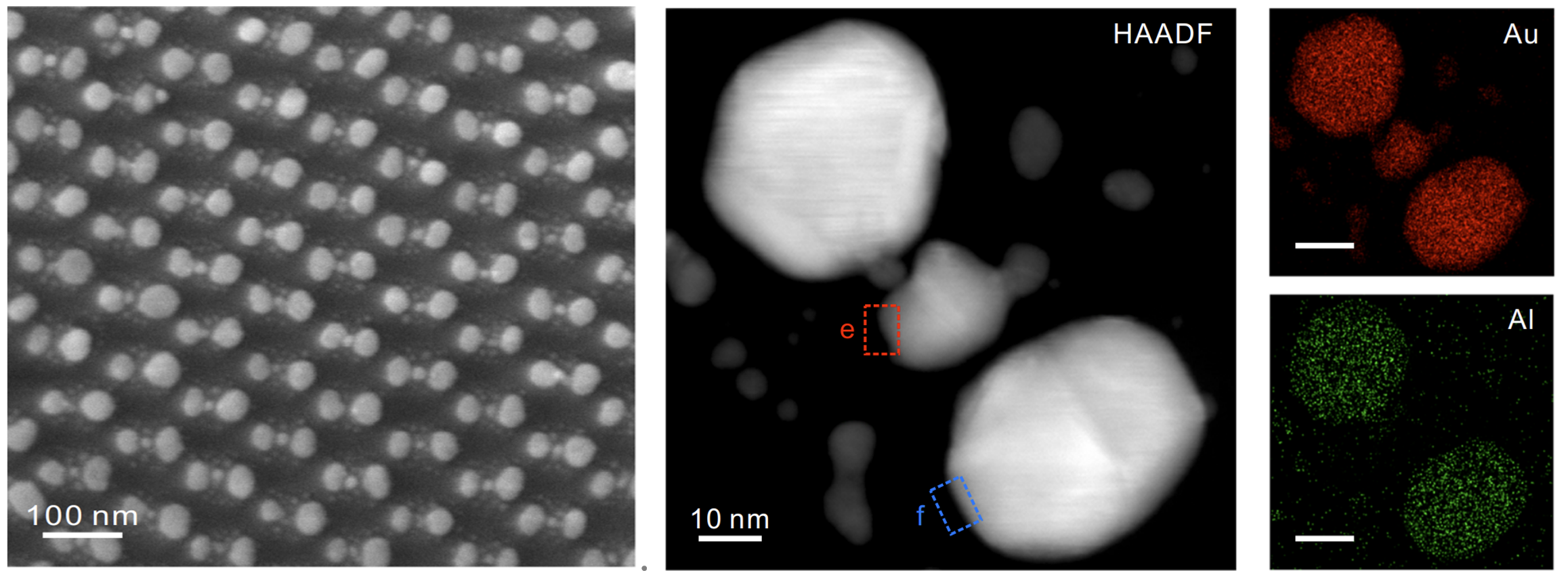 针对上述问题,3522vip浦京集团官网表面增强光谱课题组精准构筑了等离激元三聚体纳米阵列,用于解决SERS研究中普遍存在的“热点”分布不均难题,为提升SERS技术的检测效率与灵敏度开辟了新途径。研究团队采用超薄多孔氧化铝 (AAO) 技术,制备了等离激元三聚体纳米阵列,如图所示。三聚体将探针分子选择性地吸附在中心的陷阱颗粒上。实现探针分子与“热点”区域的空间匹配,从而极大提升了SERS的信号强度及可重复性。这种方法具有厘米级的样品尺寸,和 2 nm级别的颗粒间隙,为SERS增强提供了高密度的“热点”。