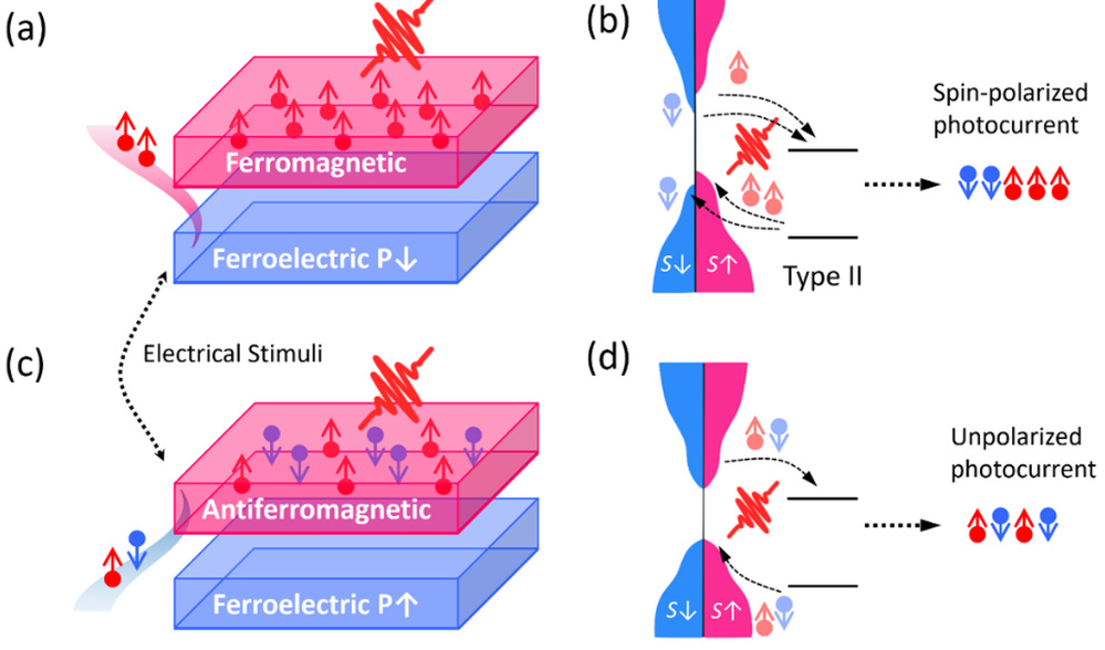 图1. 二维层状磁性/铁电异质结中自旋光电功能原理图。