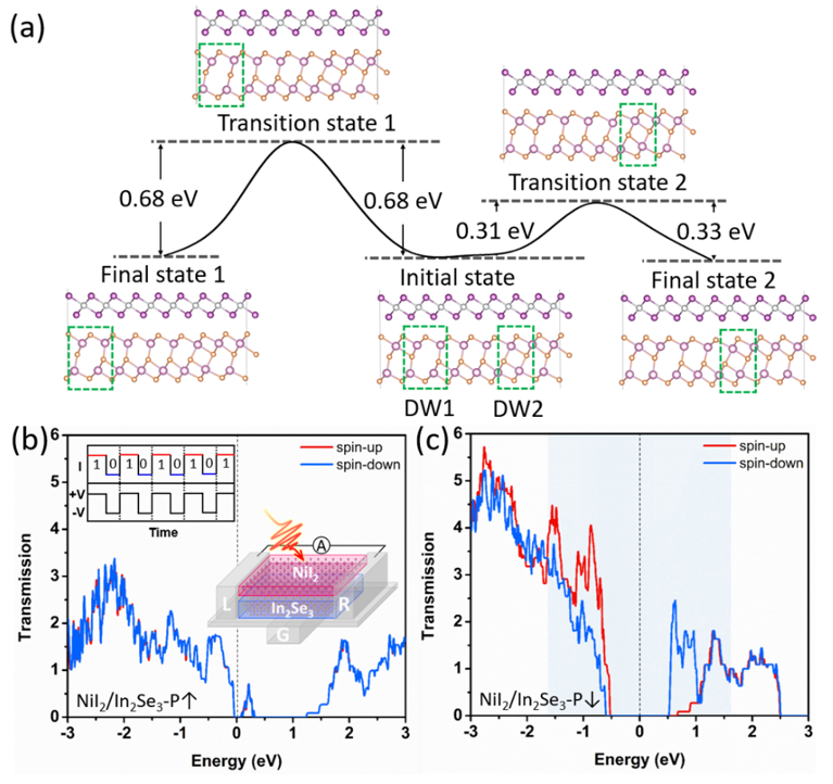 图4. (a)铁电层中两种畴壁(DW1和DW2)运动的动力学路径。(b)NiI2/In2Se3-P↑和(c)NiI2/In2Se3-P↓双层异质结的透射谱。内置图为光电流输出相对于电压开关的原理图,以及由In2Se3接触的NiI2异质结构成的自旋光电器件模型的原理图。