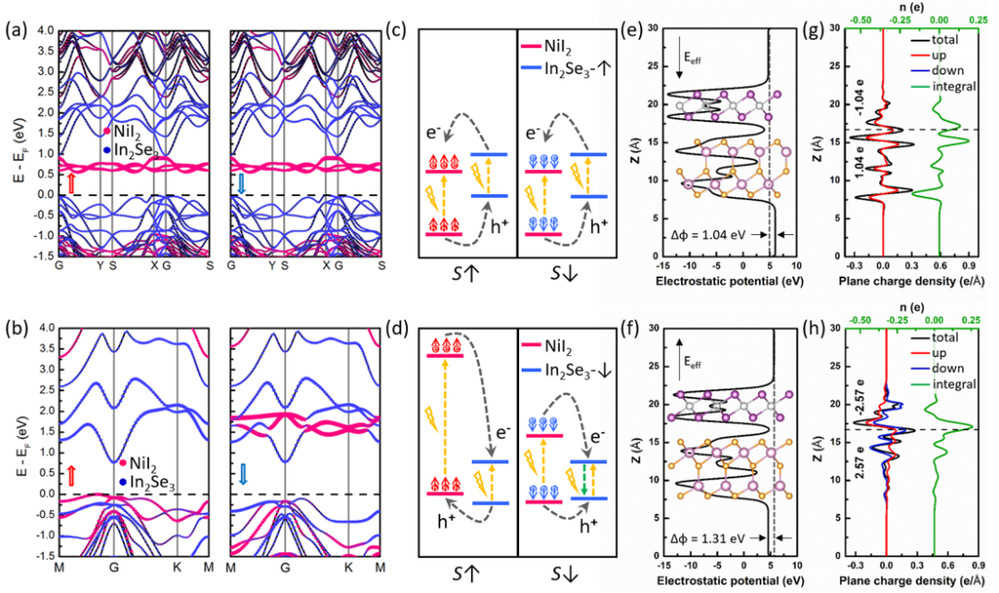 图3. (a, b)自旋极化能带结构。(c, d)能带带边和自旋相关电荷转移示意图。(e, f)xy平面内平均电势。(g, h)NiI2/In2Se3-P↑和NiI2/In2Se3-P↓双层异质结沿z方向的差分电荷密度分布(黑线)和差分电荷密度积分(绿线)。Eeff表示异质结中的有效电场。