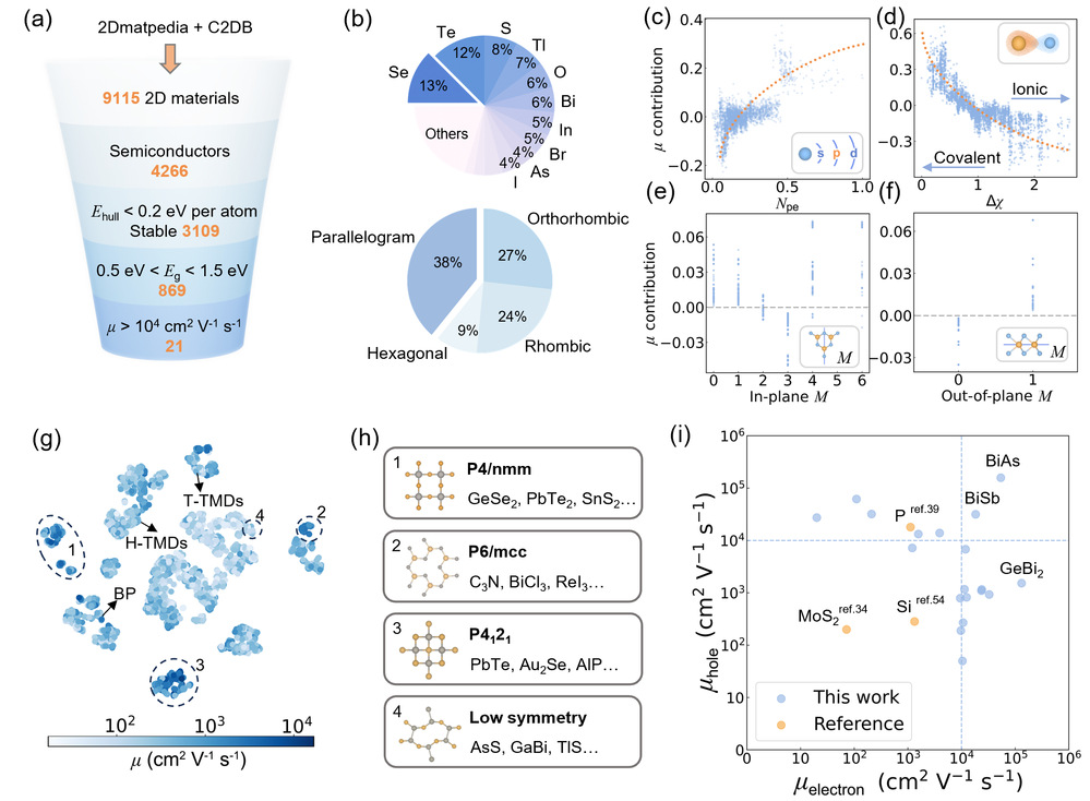 该工作开发了一套结合对抗式训练以及专家知识的混合迁移学习框架,其中对抗训练捕捉了块体和二维材料的共性特征,而专家知识的引入进一步提升了预测的准确性和泛化能力。该框架利用块体材料的有效质量数据,成功实现了对二维材料载流子迁移率的准确预测。预测流程仅需要材料晶体结构作为输入,相较于第一性原理计算,预测准确性达到90%,速度提升5个数量级。在此基础上,该工作成功筛选出21种载流子迁移率远超硅、且带隙与硅近似的二维材料,为高集成度高性能的半导体器件提供了候选材料。该工作实现不同材料不同性质间的跨域迁移,混合迁移学习框架是处理小数据集问题的通用策略,扩充了数据驱动材料设计方法的适用范围。