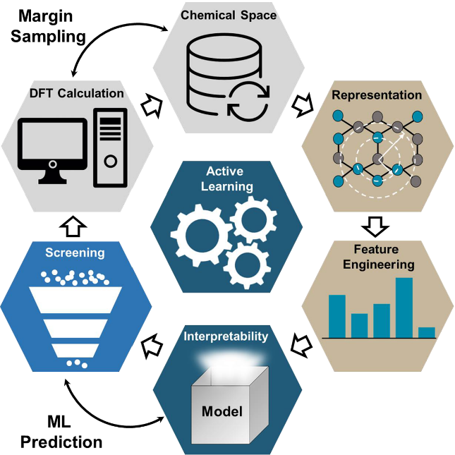 我们在先前的工作中,结合机器学习和高通量第一性原理计算初步探索了现有的二维材料数据库中,找到了一定数量的二维铁磁体。但是实际的化学空间的规模远远超过现有的数据库,且更有可能找到性能优异的二维铁磁材料。为了搜索如此庞大的化学空间,我们提出了一个具有反馈迭代功能的主动学习框架,将梯度提升算法和边缘采样算法相结合,来动态地构建完备的高质量数据集。该框架集成了特征工程,模型学习,数据采样,第一性原理计算和模型解释功能。该框架可以使我们在数据匮乏和特征维度较高的情况下,高效地搜索化学空间。