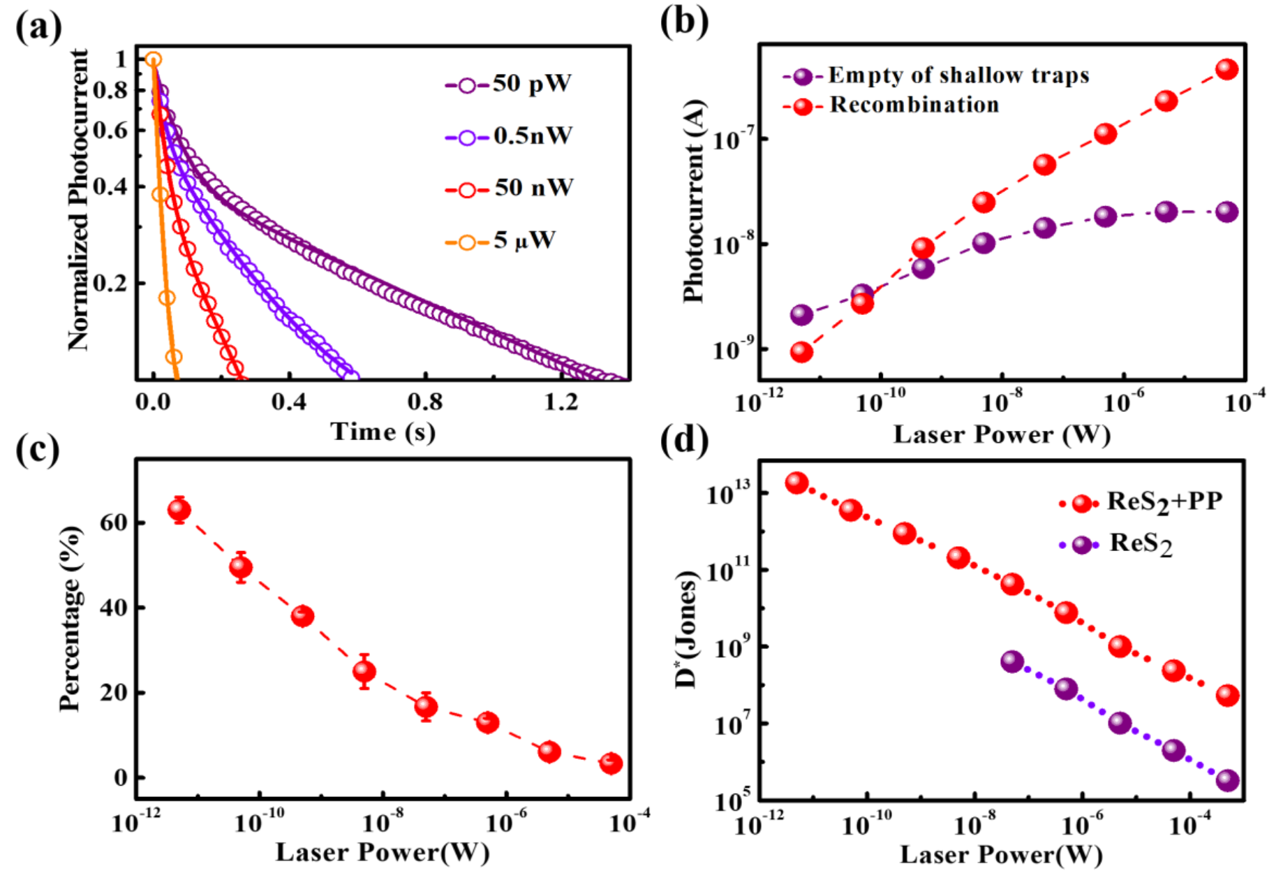 Here, we demonstrate that the trap states in two-dimensional ReS2 could be efficiently modulated by defect engineering through molecule decoration. The deep traps that greatly prolong the response time could be mostly filled by Protoporphyrin (H2PP) molecules...